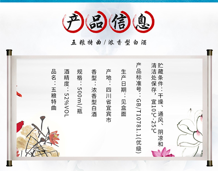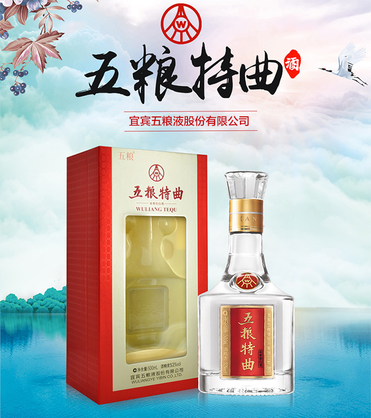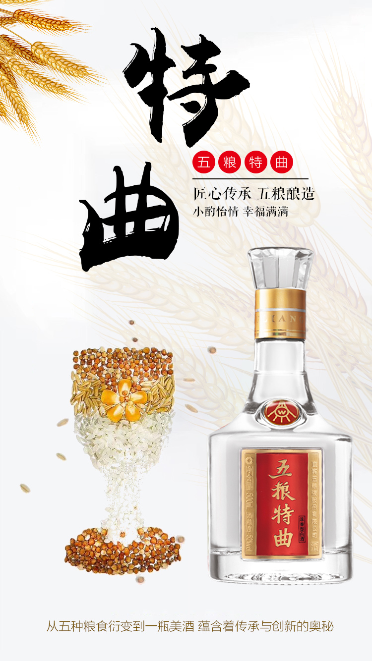 品名: :52度 五糧特曲 原料與配表:水、高粱、大米、糯米、小麥、玉米