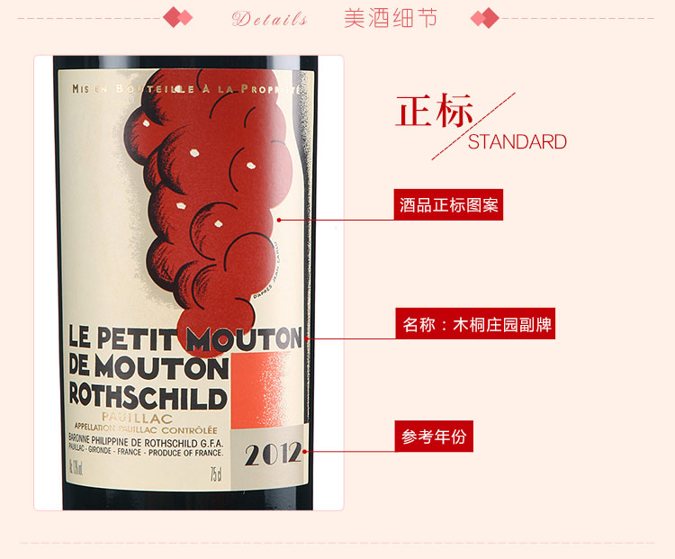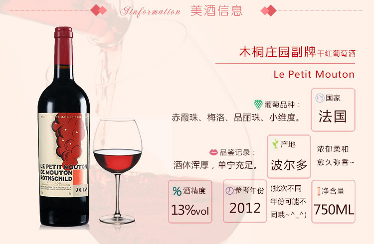 品名: :木桐副牌 法國(guó)1855梅多克木桐莊園幹紅葡萄酒 原料與配表:葡萄、二氧化硫