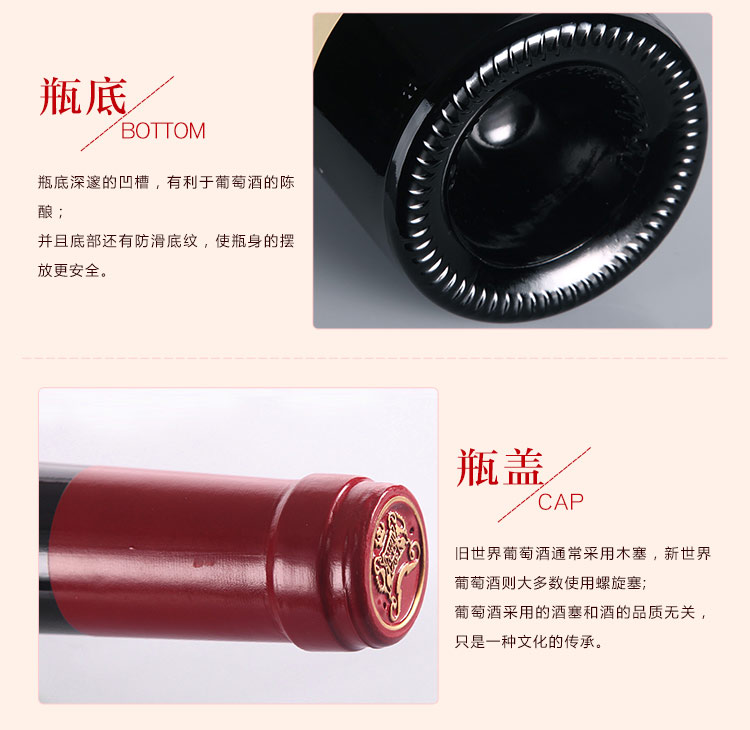葡萄品種(zhǒng):赤霞珠、梅洛、品麗珠、小維度 貯存條件:避免陽光直射、與5-25℃幹燥通風處卧放或 倒放為宜