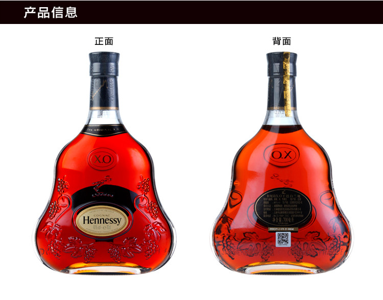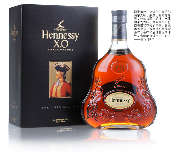 品名: :軒尼詩XO 法國(guó)原裝進(jìn)口洋酒幹邑白蘭地 原料與配表:葡萄、水、焦糖色